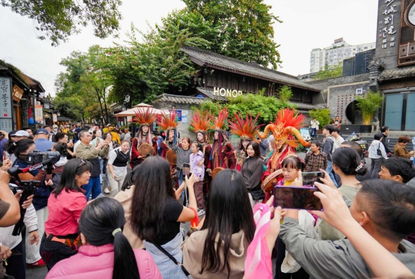 “原来这就是萨满祈福表演,太震撼了,长白山文旅真是有新意!”19日,“长白天下雪”飘在了成都市热门商圈,从春熙路到太古里、再到宽窄巷子,冰雪风情与巴蜀烟火碰撞出了别样火花。演员身着缀满彩羽与铜铃的满族服饰,手持神鼓与腰铃起舞,上演精彩的萨满祈福表演巡游,为街头巷尾增添了一丝神秘感,来往的市民在惊叹的同时纷纷举起手机记录下这一难得的场景,镜头里蕴藏着的是“长白圣山”与“天府之国”的奇妙联结。