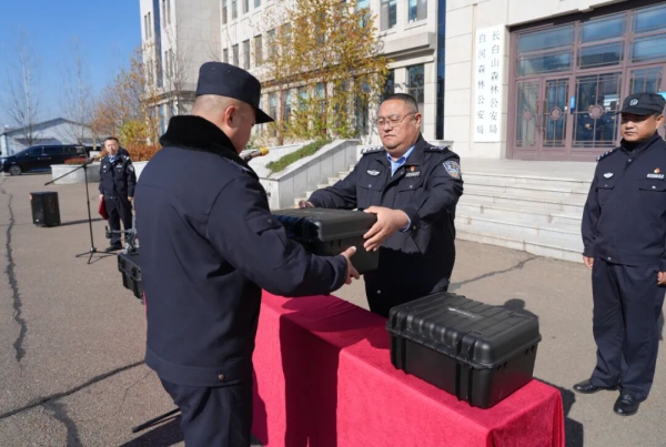 配发现场,崭新的警用无人机依次摆放,各基层所队主要负责同志及无人机操作员整齐列队,局领导为各基层单位逐一交付警用无人机,标志着长白山公安“空地一体”立体化防控体系建设迈出关键一步。随后,无人机操作团队进行实战演示,通过空中巡查、实时画面传输等科目,展示新装备在景区巡防、生态巡护、边境管控、应急处突等场景中的应用效能。