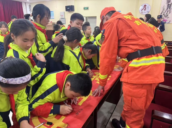 知识讲解结束后还设置了装备展示和体验环节,让学生们近距离观察和接触各种灭火装备。“消防员叔叔,这个装备叫什么呀,是干嘛的呀?”各类灭火装备让学生大开眼界,消防救援人员们耐心地讲解每一种装备的用途和操作方法,并邀请学生现场体验,感受“逆行者”的重量与责任。最后,由每名同学在森林防火条幅上签下自己的名字,表达自己将以身作则,并为森林防火贡献力量。