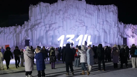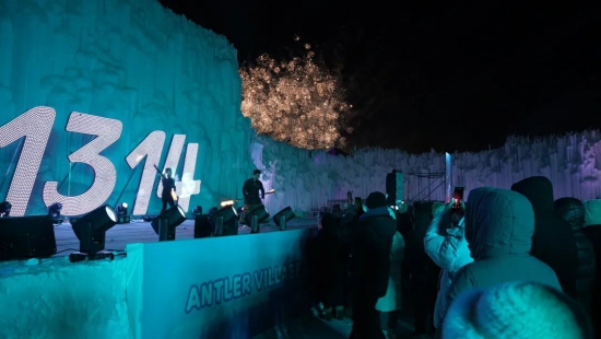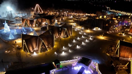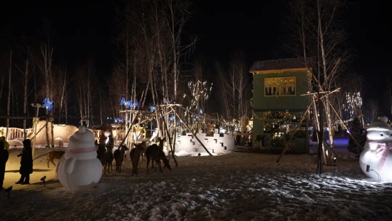入夜后的麓角村氛围热烈,园区内雪雕版青铜门、驯鹿雪橇等景观与长白山相映成趣。伴随欢快旋律,点灯仪式与花火宴会同步开启,璀璨烟花绽放夜空,DJ与MC带领游客互动狂欢,园区正式投入运营。