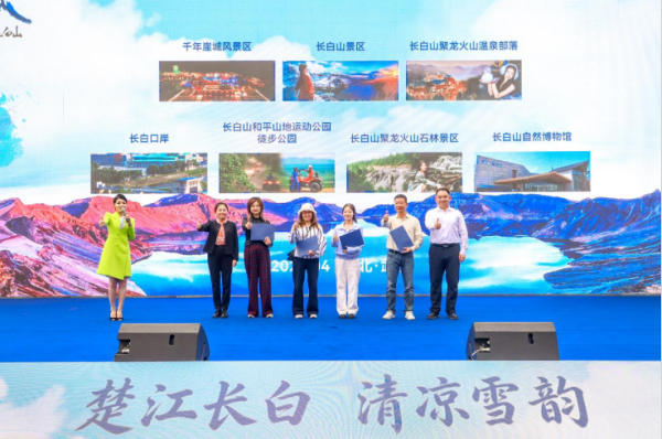 在推介环节,一场全景式长白山文旅盛宴正式展开。首先播放的《22°C的夏天 清爽长白山》宣传片瞬间让与会嘉宾沉浸在长白山夏季的清凉惬意中。随后,长白山保护开发区、白山市、延边朝鲜族自治州的文旅代表依次登台,分别围绕各自区域的核心文旅资源、特色产品线路、新业态新玩法等进行详细推介,从长白山的地质奇观、白山的生态秘境到延边的朝鲜族风情,各具特色、重点突出,全面呈现了大长白山区域生态、民俗、康养、自驾等多元的文旅资源,展现出全域联动的文旅发展格局,共同勾勒出“四时俱好”的文旅画卷。